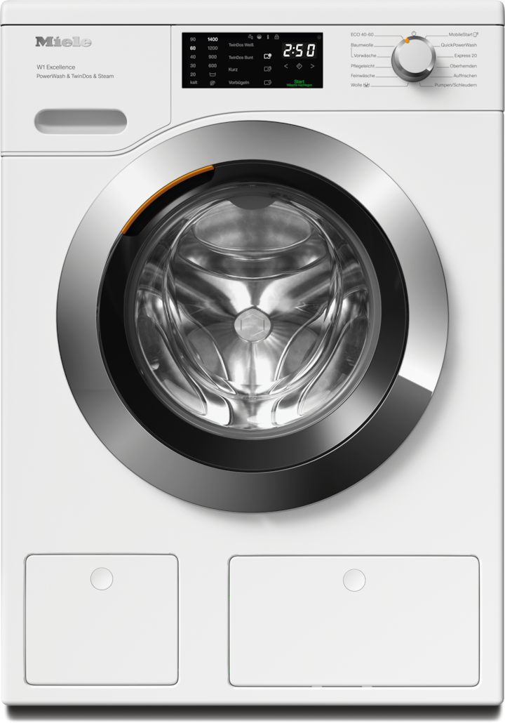 - 2.Lors du développement de la série de lave-linge W1/W2, Miele en a testé les modèles et les composants principaux avec 5000 charges (= 5 charges par semaine pendant 50 semaines par an) dans différents programmes. En savoir plus : miele.com/20years